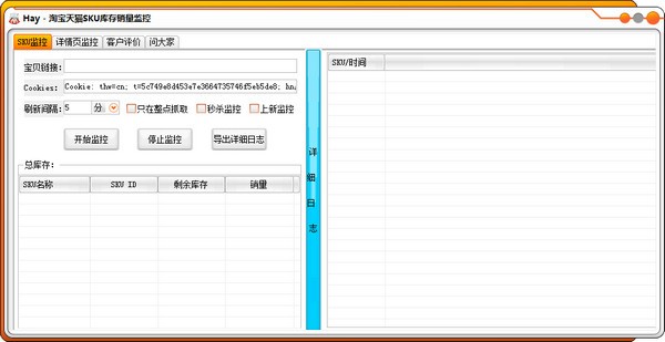 淘宝天猫SKU库存销量监控能够对淘宝、天猫实时销量监控,是一个可以用来实时查看纪录淘宝、天猫链接销售量的小软件,可以用来观察市场哪些型号卖的最好或者竞争对手的哪些SKU有猫腻!