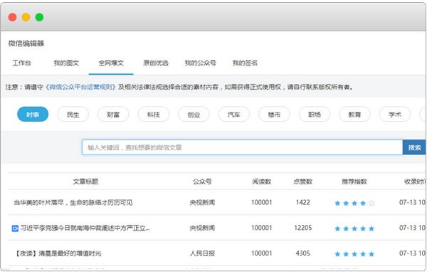自带素材库的微信编辑器,全网海量优质微信文章素材动态更新,大数据挖掘分析,优质热门文章轻松掌握。