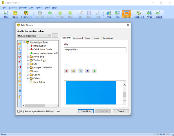 CaptureSaver将您平时零乱的资料、图片等都存放在一起,统一管理起来,方便您的查找和使用。使用CaptureSaver的树状目录结构,您可以非常方便的进行分类整理。通过按关键字进行全文搜索,可从收集的资料中迅速找回您所需要的东西。