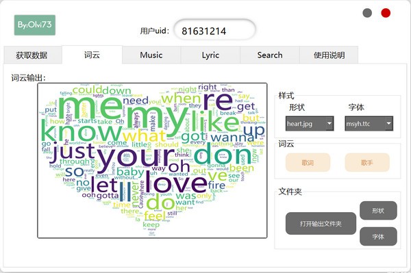 选择合适的形状以及字体,点击歌词或者歌手,生成词云。在形状和字体文件夹可以加入自己喜欢的形状图片或者字体文件。