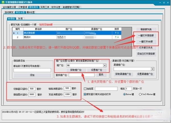 群发设置,请先获取推广位,并设置每个群的推广位,然后一键打开QQ和微信群