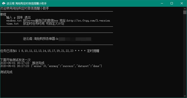 逆云阁淘抢购定时微信提醒小助手,秒杀整点提醒小工具,目前软件只做秒杀过后的时间提醒,可以修改配置文件提前提醒,接入方糖可以微信推送通知!