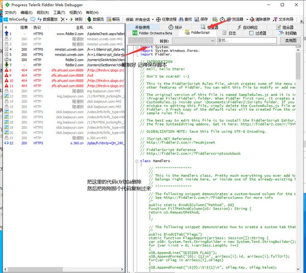 3.将一开始解压的fiddler代码文件。全部复制出来。然后打开fiddlerscript。将里面的代码全部替换为文本的代码