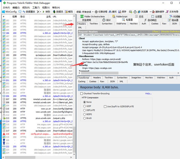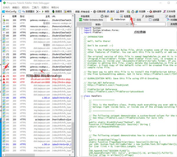 6.在fiddler里找到js图标的网址是vocabgo的点击。然后再点击检查器。