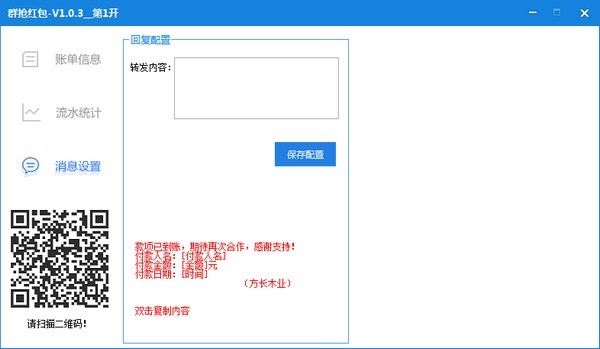 群抢红包软件支持微信的收红包、转账、扫码,拥有自动收红包,自动收转账,收扫码,读金额 、账单查询等功能,适合在电脑端使用微信的朋友!