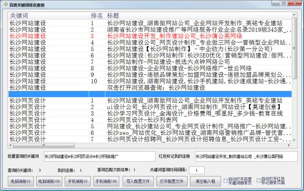 百度关键词排名查询工具是一款批量查询百度关键词排名的小工具,支持电脑端和手机端的排名查询,支持前10名和前100名的查询,支持红色标记自己的排名连接,支持自动打开排名连接,查询的每个连接都可以手动打开访问,是做seo的辅助软件,软件完全免费!