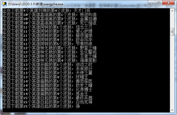 王者荣耀全英雄无水印皮肤下载器是一款简单的通过pyinstaller进行使用的图片、壁纸下载工具,软件能够一次性将王者荣耀全英雄皮肤的图片下载到电脑中的一个文件夹中用来做壁纸,是一款功能非常简单但是很好用的软件,王者荣耀的发烧友可以下载使用。