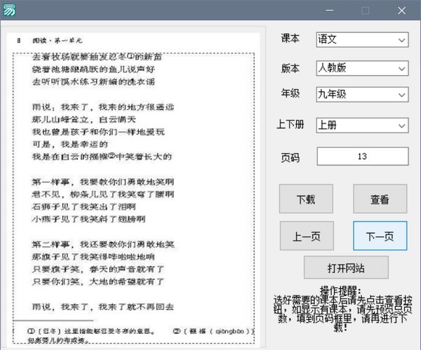 电子课本下载器是一款功能非常强大的电子课本下载工具,电子课本下载器支持人教版、部编版、苏教版、北师大、沪教版、语文版、西师大版所有版本的所有课程1-9年级书本下载,软件还支持在线预览,通过电子课本下载器用户其实不需要下载也能在电脑上翻页看书,是一款非常强大的工具。