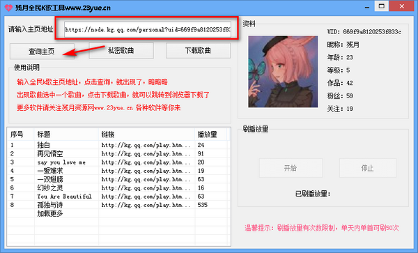 一、下载软件打开,在主页地址处输入喜欢的歌手的主页地址,点击查询主页。
