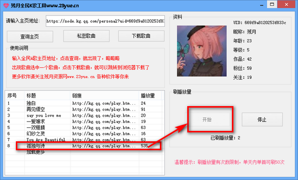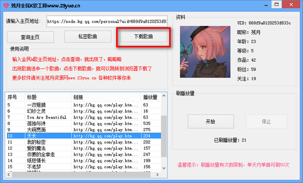 残月全民K歌工具是残月网制作的一款开源的全民K歌增加播放量和下载软件,通过残月全民k歌工具用户可以为自己喜欢的歌手刷高播放量还能轻松下载自己喜欢的歌手的歌曲和MV,喜欢玩全民K歌的用户千万不要错过了。