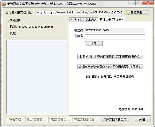 4、如果你已经注册了老张百度文库下载器就可以选择右上角的【开始下载】了,注册界面如下: