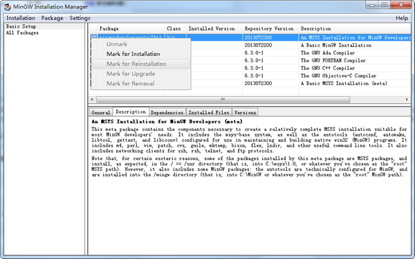 MinGW Installation是由MinGW官方出品的一款MinGW软件下载工具,通过MinGW Installation可以根据自身情况下载和安装MinGW的所有工具包,包括mingw32-gcc-g++(GNU C++编译器)、mingw32-gcc-objc(GNU Objective-C编译器)、mingw32-gcc-ada(GNU Ada编译器)等等。