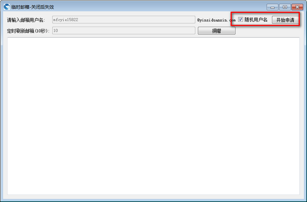 软件功能很简单,勾选随机用户或者自己填写一个6位以上的用户名,然后点击开始接收邮箱,等出现邮箱号码后,就可以等待接收邮件了。