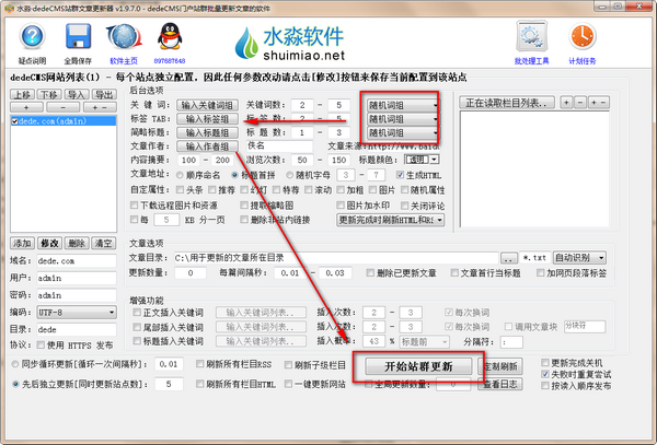 水淼dedeCMS站群文章更新器是由水淼软件出品的一款专门用于站群批量更新的软件,通过水淼dedeCMS站群文章更新器用户可以轻松的管理自己的dedecms站群文章,软件还支持关键词插入,seo优化,尤其适合各位新手站长使用。