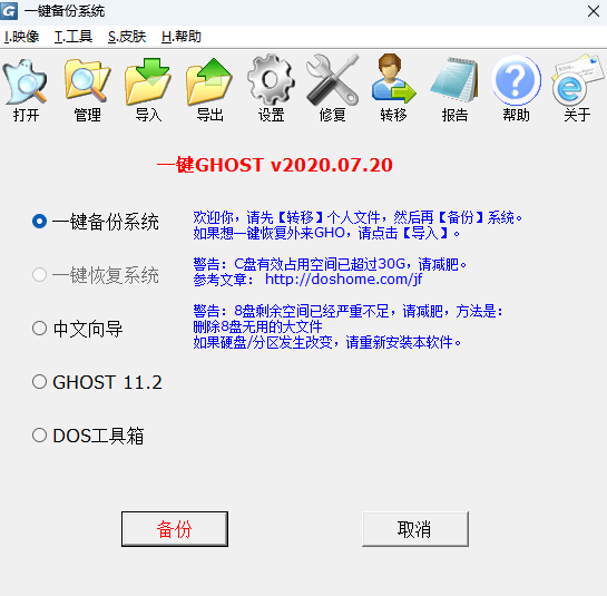 一键ghost硬盘版是"DOS之家"首创的4种版本(硬盘版/光盘版/优盘版/软盘版)所同步发布的启动盘,满足用户们的各种需求,适应各种用户需要,既可独立使用,又能相互配合.一键ghost硬盘版主要功能包括:一键备份系统,一键恢复系统,中文向导,GHOST,DOS工具箱,只需按一个键,就能实现全自动无人值守操作,让你一爽到底!