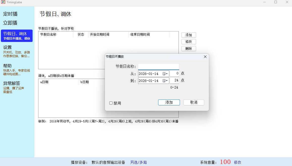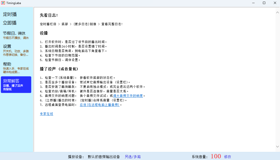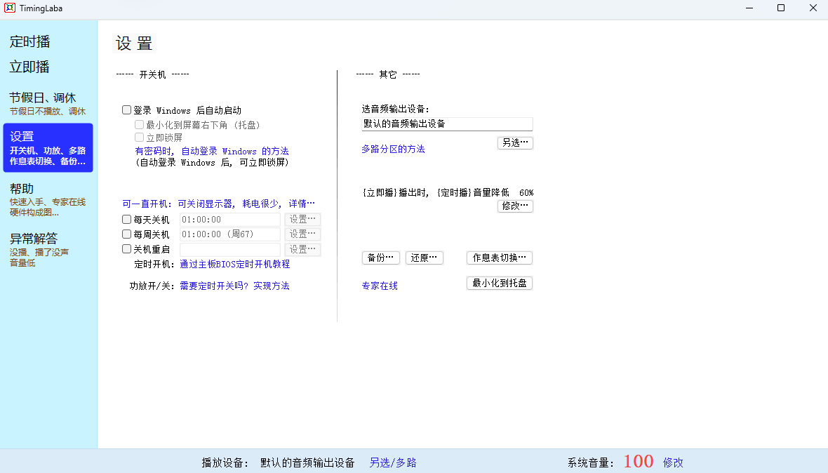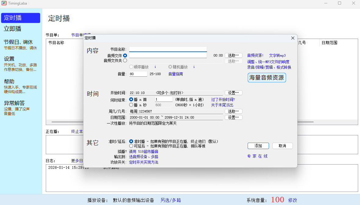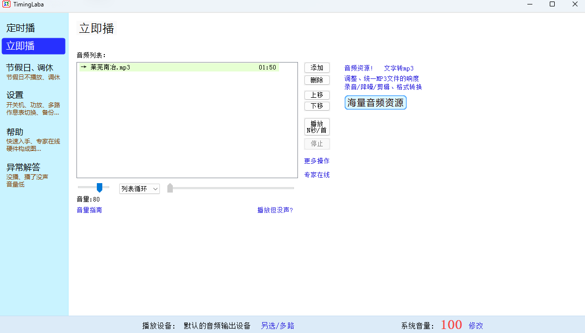 TimingLaba(定时喇叭)是一款电脑定时播放音乐软件,音乐定时播放器。适用于幼儿园、学校、工厂、军营、消防站等的广播/打铃,将电脑音频输出连接至功放机即可。