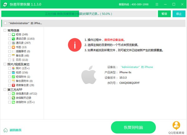 1、从iPhone/iPad设备恢复 此步骤根据用户勾选的扫描类型和手机数据大小所需时间可能比较长,请用户耐心等待 扫描结果。