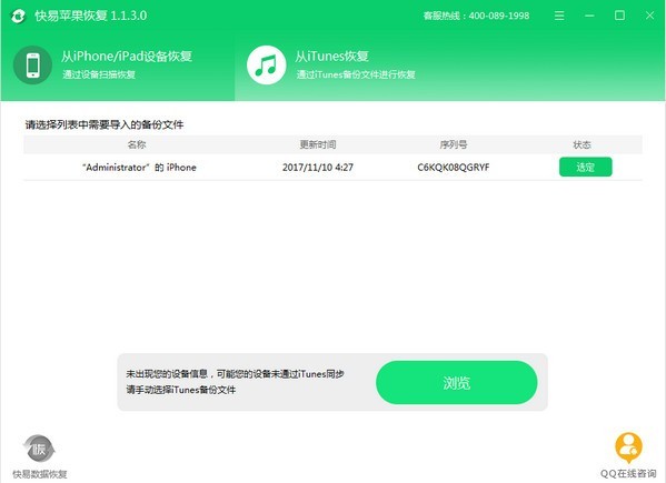 2、从iTunes恢复:软件默认只扫描iTunes备份目录下的文件,如果用户是通过其它备份工具(或把iTunes 备份目录拷贝到其它文件夹下),则需要点击软件上的“预览”按钮自行选择扫描目录。