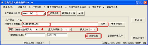 1. 选择分区。选择需要恢复数据的盘(即源盘),必须在上图标记为1的下拉列表中有对应的盘符,才能进行恢复。对于数码相机、存储卡和U盘之类的即插即用设备,需要先将设备连接到电脑USB口,后打开软件,才能选择相应的盘符。有的相机用USB连接线连到电脑USB口,在电脑上并不出现盘符,就需要把存储卡取出,用读卡器连接电脑进行恢复。本软件可支持从软盘、硬盘、光盘、USB闪存盘、各种存储卡、相机等恢复消息文件;
