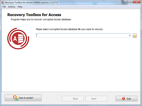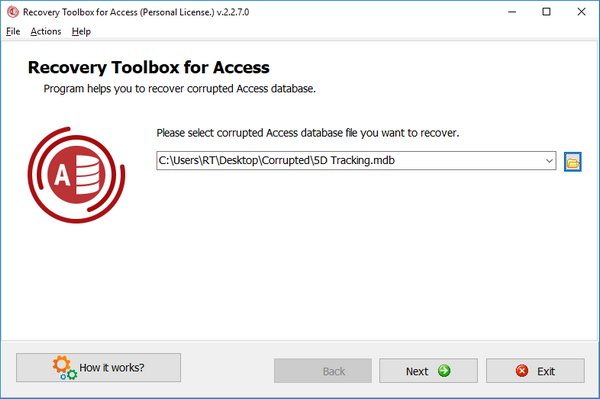 当Recovery Toolbox for Access启动时,用户会看到一个窗口,提示选择源文件进行进一步处理源文件的路径及其名称是通过键盘输入的。