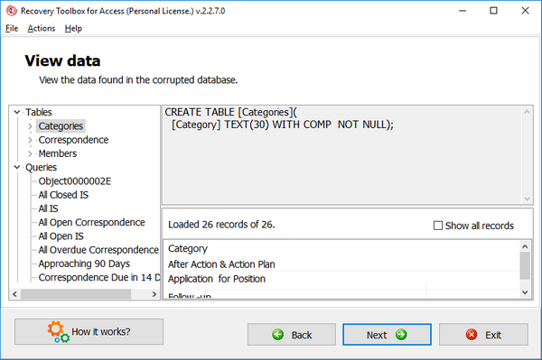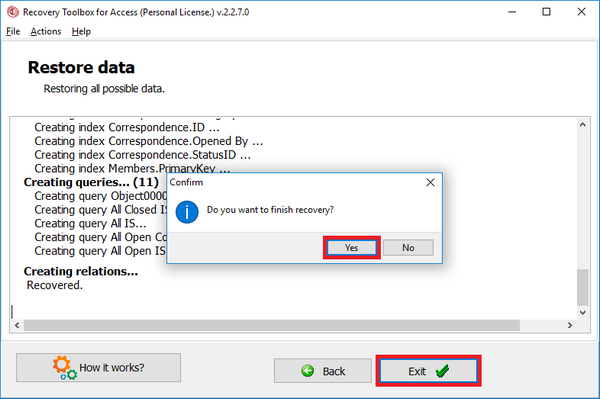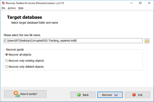 用于访问的恢复工具箱不从加密文件中恢复数据。可以恢复未加密的受密码保护的文件,但密码会丢失。此外,该软件不恢复报告、页面、模块、宏、链接和引用其他数据库的字段、用于在编辑器字段中显示元素的特定于访问的功能以及用于值选择的限制。