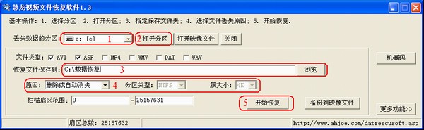 1.选择分区。选择需要恢复数据的盘(即源盘),必须在上图标记为1的下拉列表中有对应的盘符,才能进行恢复。对于数码相机、存储卡和U盘之类的即插即用设备,需要先将设备连接到电脑USB口,后打开软件,才能选择相应的盘符。有的相机用USB连接线连到电脑USB口,在电脑上并不出现盘符,就需要把存储卡取出,用读卡器连接电脑进行恢复。本软件可支持从软盘、硬盘、光盘、USB闪存盘、各种存储卡、相机等恢复视频文件。