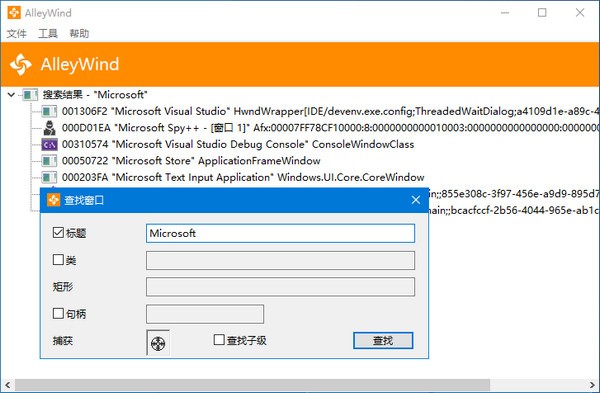 一样可以鼠标捕获、输入句柄、通过标题和类名进行搜索,后两者支持模糊搜索,显示结果集!