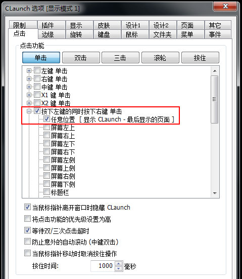 个人喜欢将显示 CLaunch 的快捷键设为鼠标左键、右键一起按。设置地址是“选项”->“点击”->“单击”