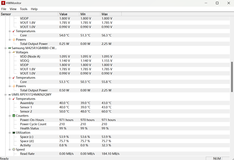 HWMonitor是一款电脑硬件监控器,可以即时监测电脑配件(如主板、CPU、显卡和硬盘等)电压、温度和风扇转速等信息,HWMonitor具有实时监测的特性,方便实用,通过传感器可以实时监测cpu的电压、温度、风扇转速,内存电压,主板南北桥温度、硬盘温度,显卡温度等。