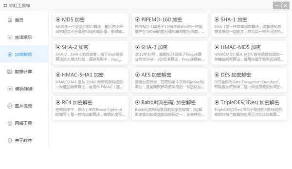 彩虹工具箱支持Mac和Windows系统(不支持XP系统),如果对Linux版本的需求较多,也可对Linux进行适配。目前根据工具的分类,划分出生活娱乐、加密解密、数据计算、编码转换、图片视频、网络工具等分类