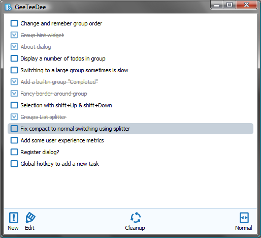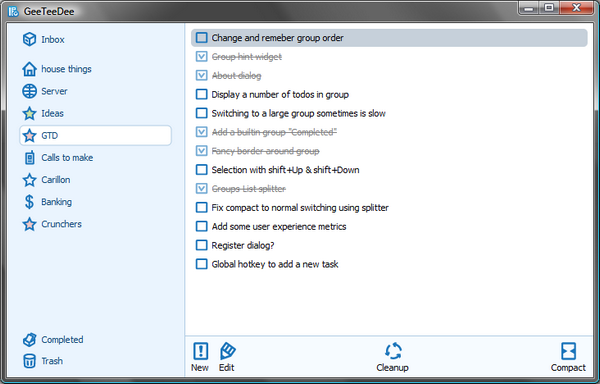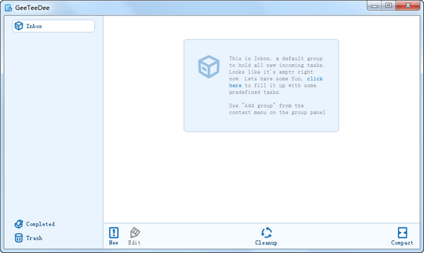 GeeTeeDee是一款小巧的分组型任务管理工具,但这款软件并不严格按照GTD的流程来执行,它精简了不少GTD流程,大家可以按自己的需求选用之。GeeTeeDee支持分组任务、任务拖放、定制分组。