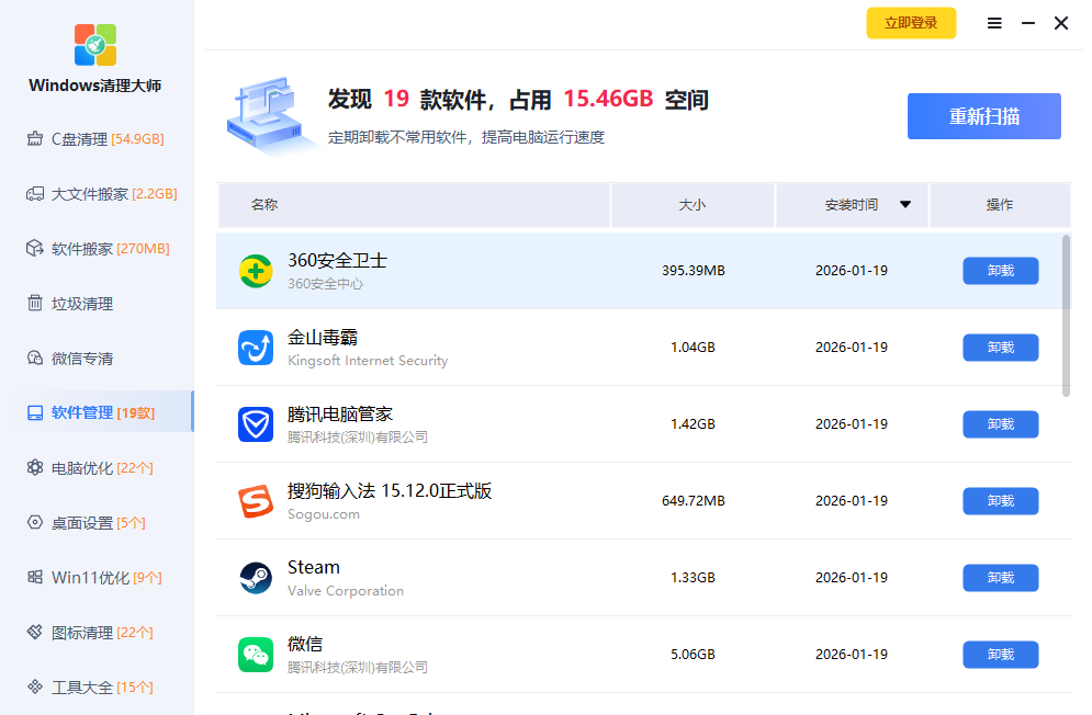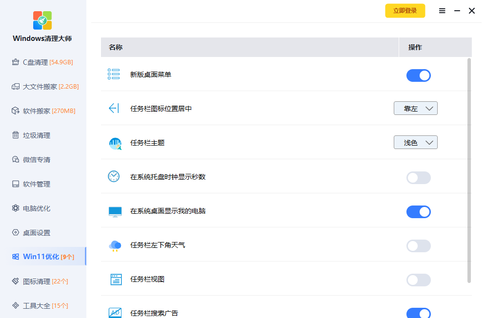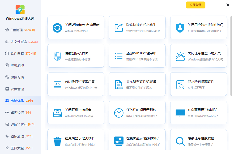 Windows清理大师专注解决各种电脑问题,清理C盘垃圾、清理流氓软件、关闭Windows自动更新、去除桌面图标小箭头、修复网络异常,为您的系统提供专项优化方案,持续为电脑保驾护航!