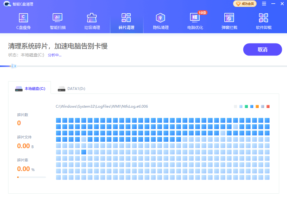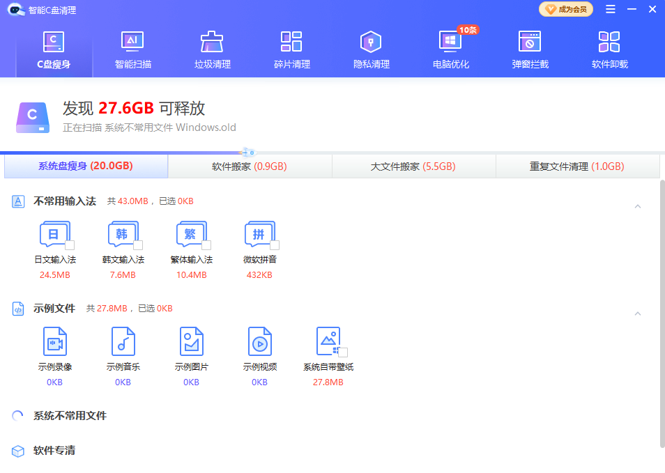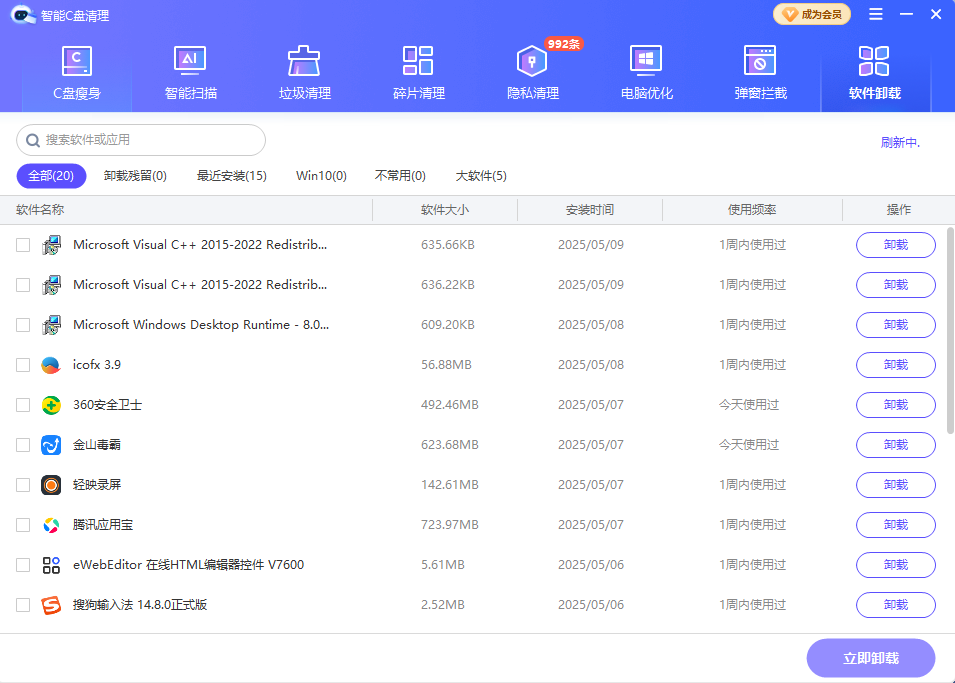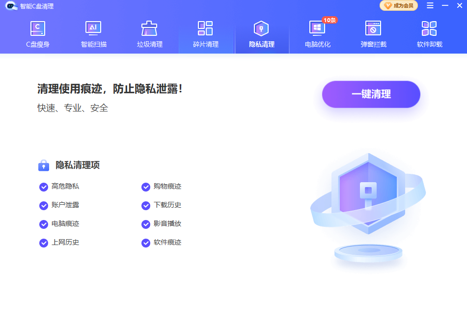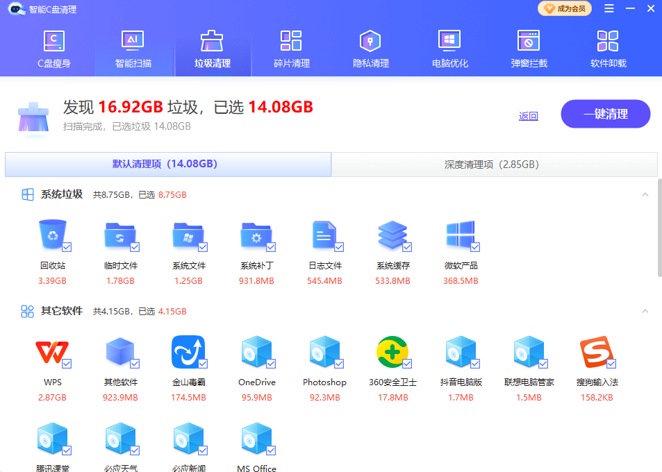 智能C盘清理,支持一键C盘瘦身,深度清理垃圾文件,清理电脑使用痕迹,保护个人隐私,专业、安全,绝不误删有用文件。