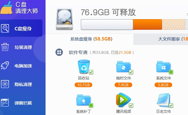 C盘清理大师是一款系统盘瘦身工具,可以帮助用户对系统盘进行一键瘦身,清理系统盘虚拟内存,补丁备份,软件垃圾等,全面提升电脑性能。