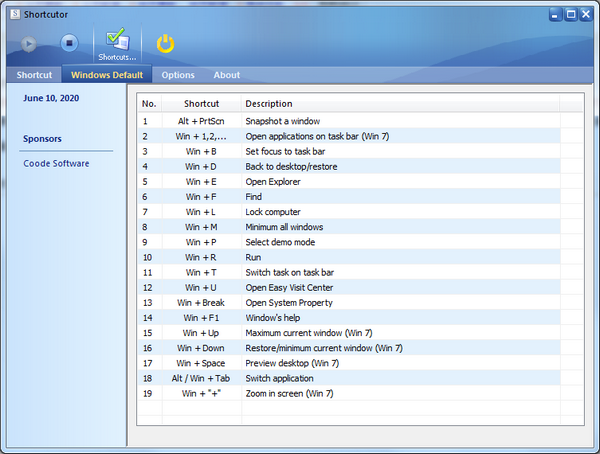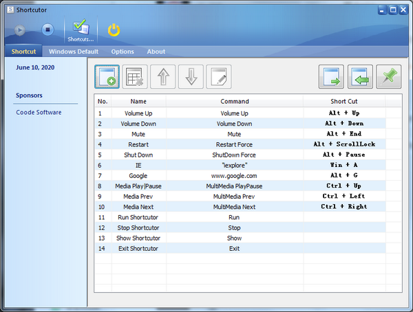 shortcutor是免费好用的快捷键管理工具。可以方便的添加和管理常用程序的快捷键,实现快速启动所需的程序。另外,它还支持快捷键调节音量、用普通或强制方式重启或关机等。
