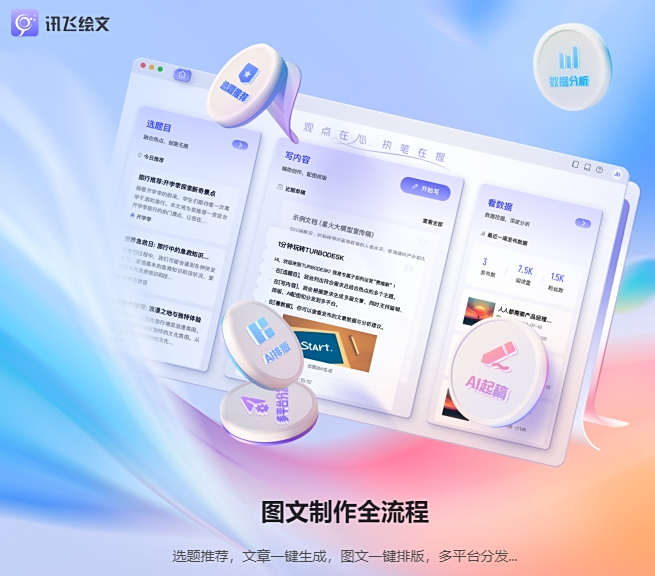 讯飞绘文(原星火内容运营大师),集AI写作,选题,配图,排版,润色,发布等功能为一体的智能创作平台。通用稿件30分钟生成,深度稿件效率翻番。应用于企业公众号,头条,新闻、等场景。释放创意,让内容创作更轻松!