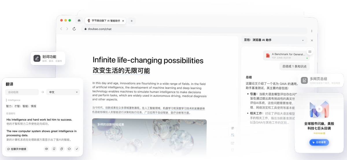 豆包浏览器插件是你的 AI 助手。它可以常驻在你浏览器的侧边栏,帮你回答各种问题。它也可以快速总结和翻译网页,阅读论文,总结视频网站,以及帮你快速撰写邮件。