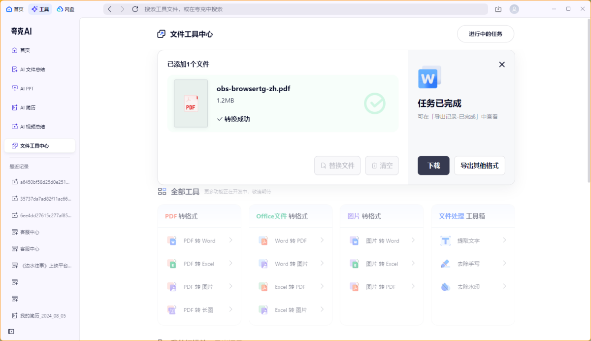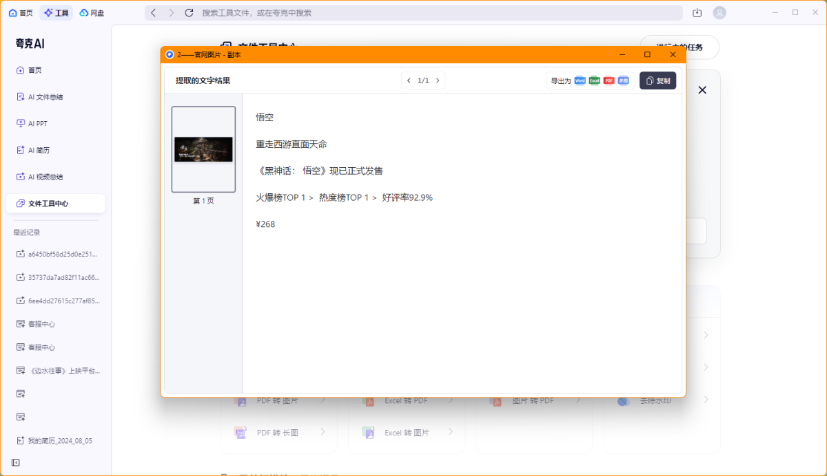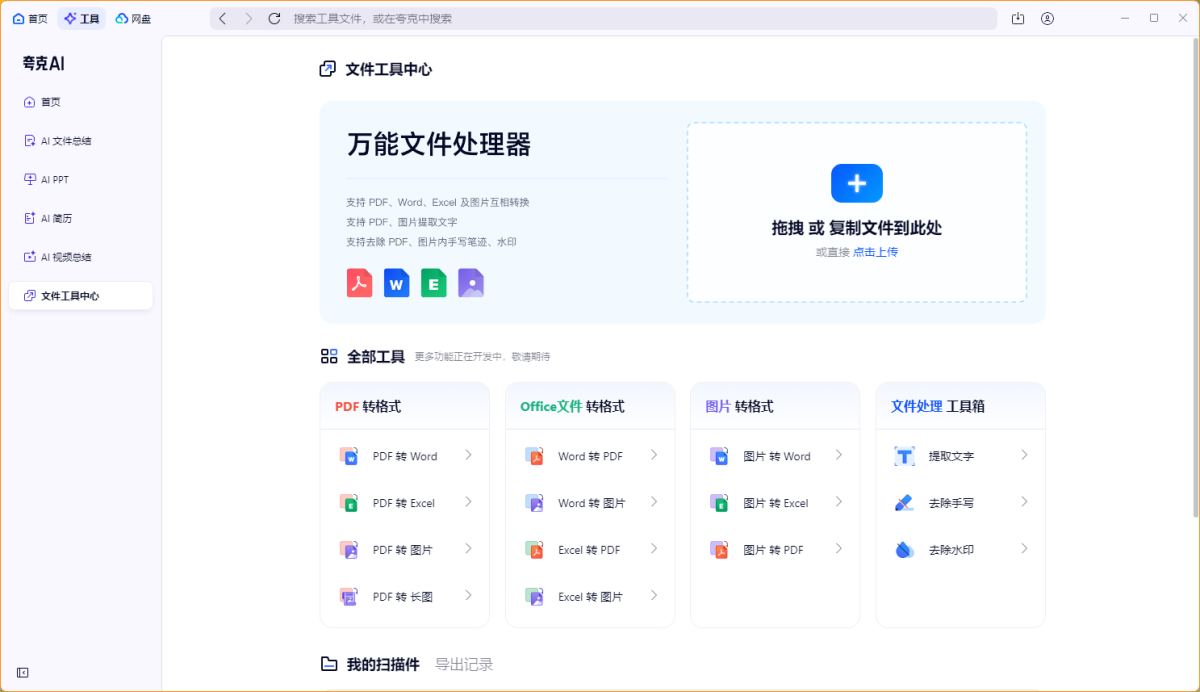 夸克扫描王(夸克pc端集合了网盘、浏览器、扫描等功能),支持图片免费生成高清扫描件,万能格式转换。OCR识别提取文字还原排版,图片转PDF/Word/Excel,证件、合同、书籍、发票、海报各类文件万能扫描,文件智能优化多端同步。还有自拍证件照、去手写、去水印、智能消除笔、智能抠图等多种智能工具等你探索。