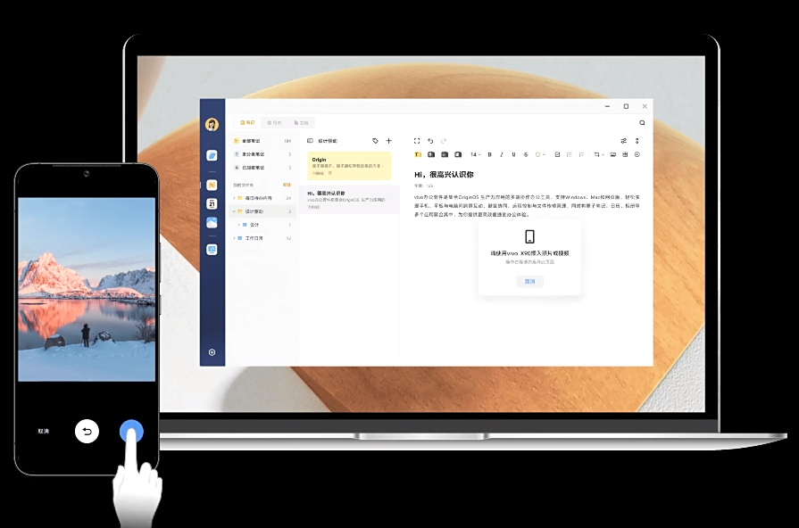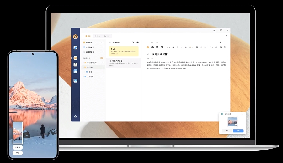 vivo 办公套件是集合 OriginOS 生产力应用的多端协作办公工具,支持 Windows、Mac 和网页版,轻松实现手机、平板与电脑间跨屏互动、键鼠协同、远程控制与文件传输管理,同时将原子笔记、日历、相册等多个应用聚合其中,为你提供更高效便捷的办公体验。