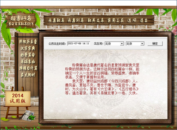 软件由周易学术联盟专业老师做顾问,花费巨资耗时三年精心打造,凝聚了千百年来,经过检验的专业知识,内置姓名学、周易阴阳五行术、子平四柱命理学及康熙字典、新华字典、诗经、楚辞、唐诗宋词、经典文库等大量专业书籍和珍藏资料,严格按照命理学五格剖象法、周易五行理论、子平四柱命理学标准,采用生辰八字+五行补助+五格配置+三才数理+姓氏性别+好听等各种因素综合筛选,让您一键从百万名字里筛选出适合宝宝+评分99以上“超吉”好名字! 并具有实用的 本软件除了具备专业的经典文库取名、诗词取名、高分取名、取英文名、专业测名等强大功能外,还附带各种实用工具,如八字排盘、阴阳历互查、真太阳时查询、汉字字典、号码吉凶测算、预产期宝宝纪念日计算等。