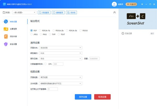 转转大师PDF虚拟打印机支持输出为PDF、PDF/A、PDF/X、JPEG、PNG、TIFF、TEXT格式,支持批量打印,软件转换速度快,并且支持设置文件输出的格式、标题、作者、主题、关键字、封面、背景、水印、页面大小等个性化设置,还提供PDF加密保护,签名文档,为您提供轻松便捷的文档转换解决方案。