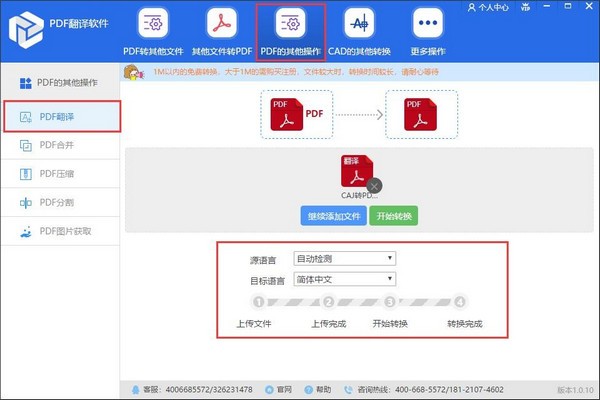 2、多种功能格式操作可完成PDF格式翻译之外,软件还支持PDF合并、PDF压缩、PDF分割及PDF图片获取功能,可帮助用户轻松搞定PDF文件的多种操作;