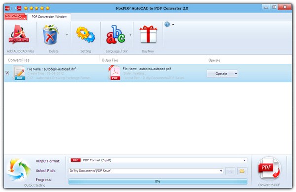 . FoxPDF AutoCAD to PDF Converter支持多种版本的DWG和DXF文件,支持R12、R13、R14、2000,2004、2010、2011和2012等格式的DXF或dwg文件;