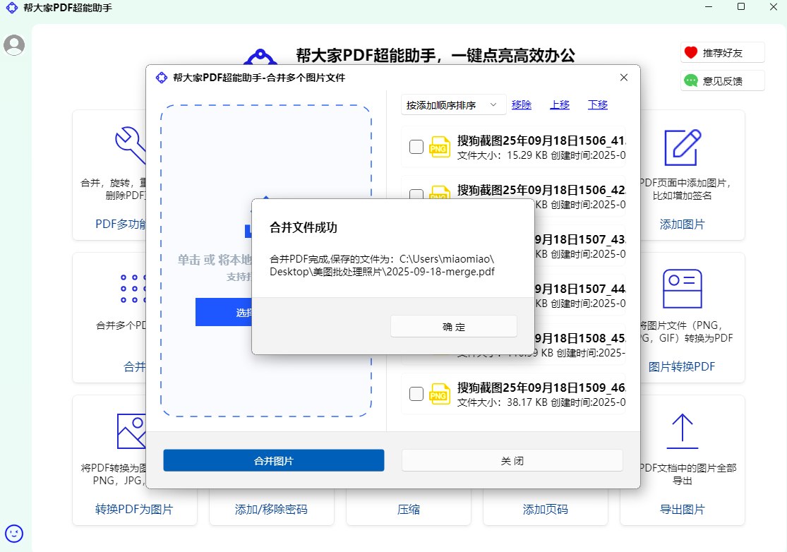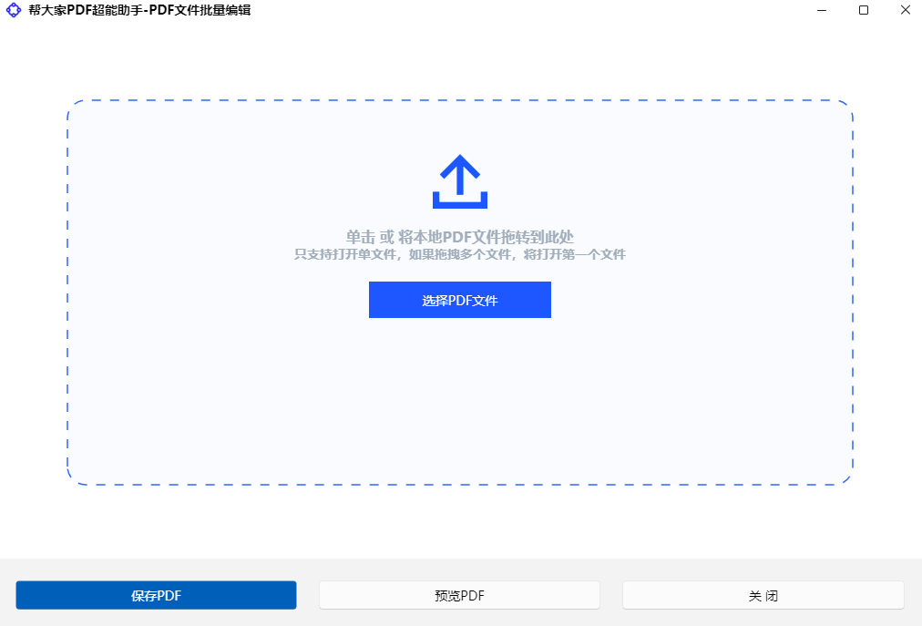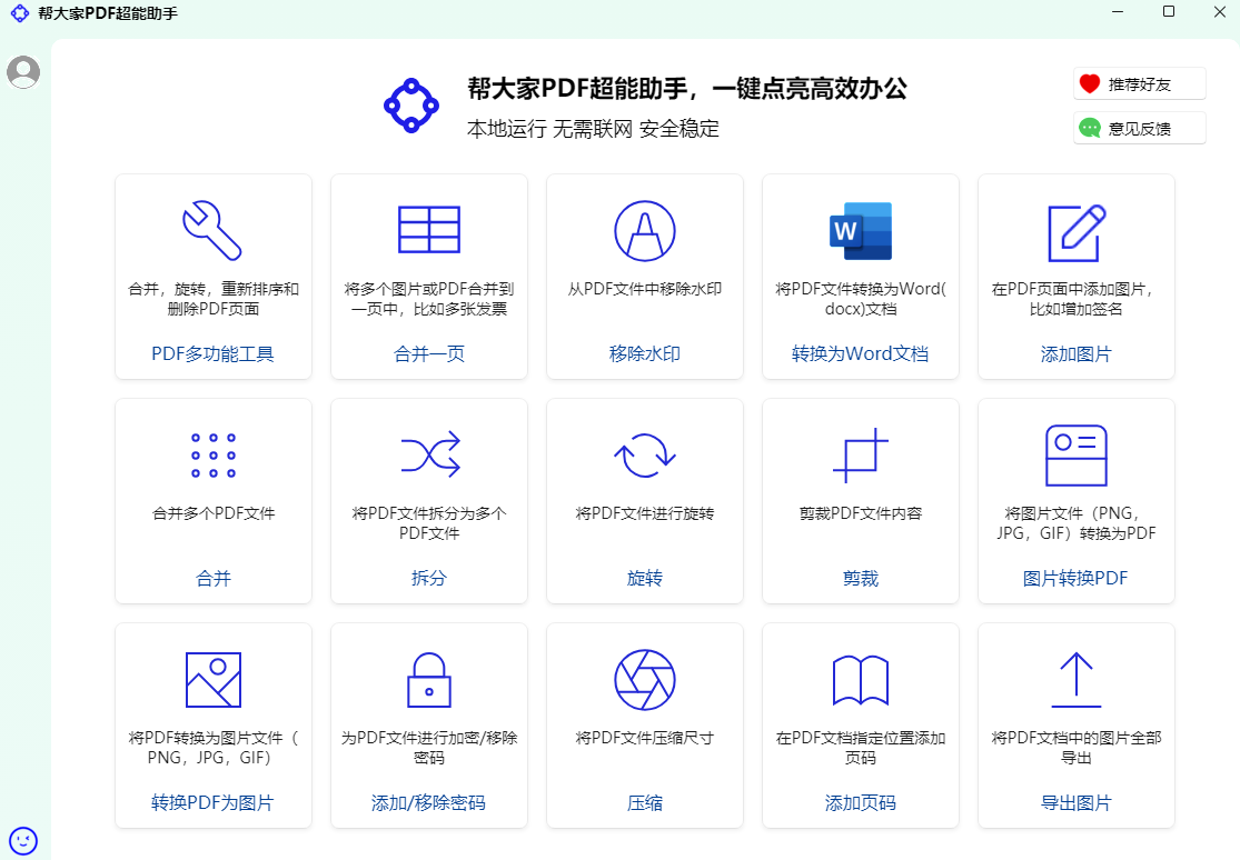 帮大家PDF超能助手是专业的PDF免费工具,提供PDF合并、拆分、压缩、加密解密、图片转换、PDF转Word、水印添加等20+功能。本地运行保护隐私,完全免费无限制,支持批量处理,是您PDF办公的最佳助手。