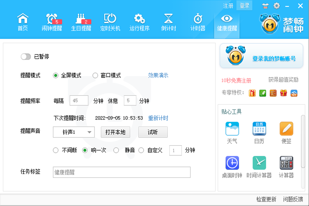 梦畅电脑闹钟官方版是一款免费的定时执行计划的软件,梦畅电脑闹钟官方版可设定多组定时闹铃(可自定义文字、铃声)、定时执行指定文件(如文本文件,MP3文件、可执行程序)、定时关机、整点报时等计划,每个计划都可以设定周期、具体时间,您可以随时删除不需要的计划,此外梦畅电脑闹钟官方版还可以自定义提醒内容、铃声,定时关机人性化地添加了倒计时的功能,以防您在未被告知的情况下被强制关机。