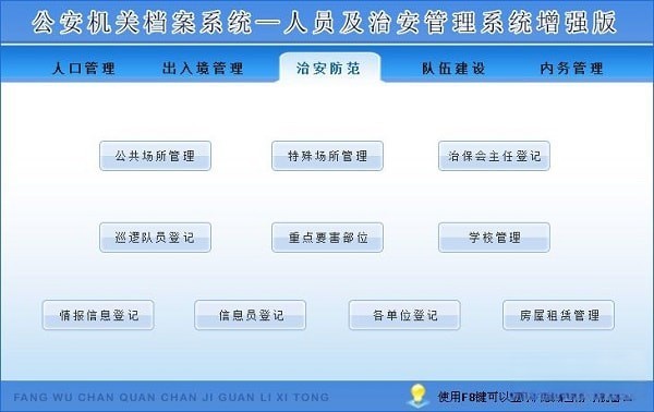 “治安防范”(公共场所管理,特殊场所管理,治安会(治保会主任登记,巡逻队员登记),重点要害部位,学校管理,情报信息登记(信息员登记),各单位登记,房屋租凭管理)