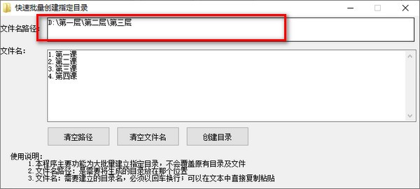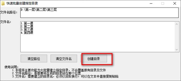 1、本程序主要功能为大批量建立指定目录,不会覆盖原有目录及文件