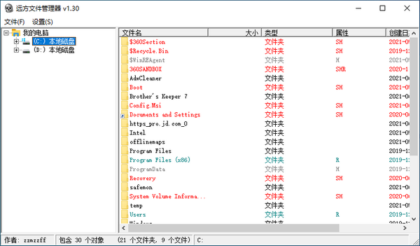 界面仿照Syscheck做的,文件名用不同颜色标识,黑色表示没有其它属性的文件或文件夹,红色表示具有“系统”属性的文件或文件夹,灰色表示具有“隐藏”属性的文件或文件夹,绿色表示具有“只读”属性的文件或文件夹。思路来源于FolderSniffer,这个工具在某些角度看算是对FolderSniffer的改进。