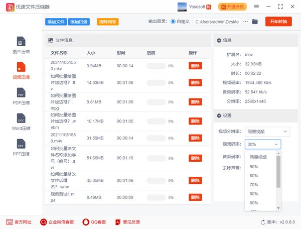 支持MP4、flv、avi、mov、wmv、mkv等十余种视频格式,可对视频分辨率进行快速的压缩