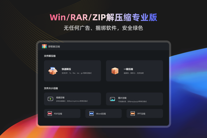 野葱解压缩是一款纯净的解压缩文件管理工具,压缩无广告、无捆绑,一键解压,高效省时;解压文件可预览,压缩文件可加密,操作简单,绿色安全、值得信赖!支持一键极速压缩/解压,50+种RAR、ZIP、7z等格式,同时支持视频、图片、PDF、word、PPT等文档的压缩。